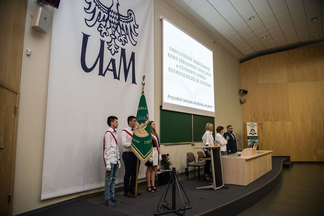 W poniedziałek 2 września br. w Auli IKE UAM w Gnieźnie, miała miejsce uroczysta inauguracja roku szkolnego 2019/2020 w Cechowej Szkole Rzemieślniczej w Gnieźnie. Licznie zebrani uczniowie wszystkich klas Szkoły Cechowej, wraz z Dyrekcją Placówki, Przedstawicielami Zarządu Cechu Rzemiosła i Małej Przedsiębiorczości w Gnieźnie, Gronem Pedagogicznym, Mistrzami Szkolącymi, Rodzicami oraz zaproszonymi Gośćmi radośnie rozpoczęli czas pracy i nauki – okres twórczego mierzenia się z wyzwaniami, odkrywania swoich talentów oraz nawiązywania nowych przyjaźni. Niezwykłą radością napawa fakt, że w tym roku Społeczność CSR Gniezno powiększyła się o pięć klas pierwszych – na podbudowie gimnazjum i szkoły podstawowej. Zebrani na uroczystości członkinie i członkowie Wspólnoty Szkolnej, otrzymali serdeczne życzenia od Starosty Gnieźnieńskiego Piotra Gruszczyńskiego, Przewodniczącego Rady Powiatu – Dariusza Pilaka oraz Przewodniczącego Rady Miasta Gniezna – Michała Glejzera.