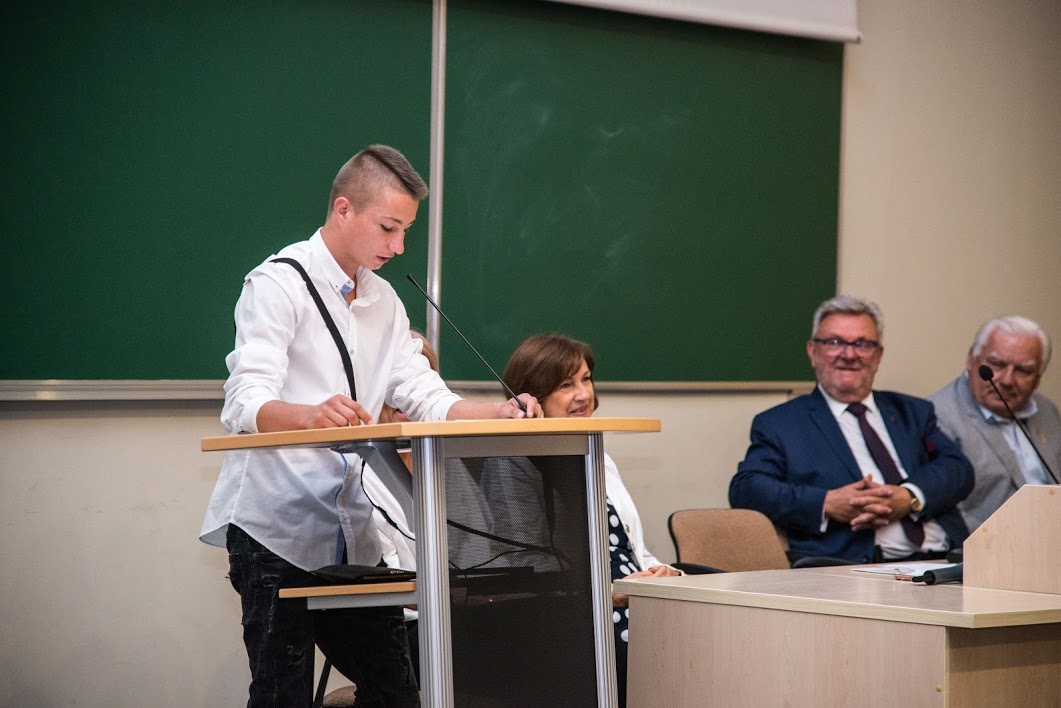 W imieniu starszych kolegów i koleżanek, tegorocznych pierwszaków przywitał Adrian Kukurenda – uczeń klasy 3B. Przywitał w sposób wyjątkowy, bowiem gwarowo, posiłkując się tekstem przygotowanym przez Panią Pedagog Krystynę Żok – szkolną regionalistkę.