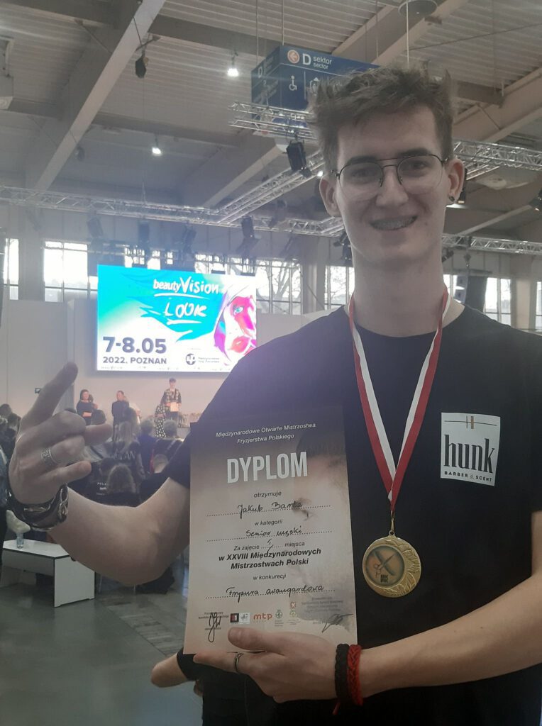 Absolwent Cechowej Szkoły Rzemieślniczej w Gnieźnie – Jakub Bartz, zaliczył wspaniały debiut w XXVIII Mistrzostwach Polski we fryzjerstwie. Młody i utalentowany rzemieślnik zajął I miejsce w kategorii senior męski, w konkurencji „Fryzura awangardowa”. Serdecznie gratulujemy wspaniałego sukcesu.