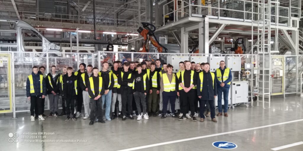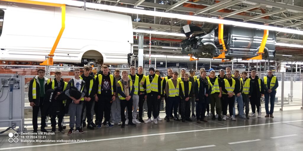 W środę 18 grudnia 2024 r grupa uczniów Cechowej Szkoły Rzemieślniczej w Gnieźnie (mechanicy i elektromechanicy pojazdów samochodowych) zwiedzała zakład Volkswagena we Wrześni. Byliśmy na dziale spawalni oraz montażu samochodów dostawczych Crafter, a także zostaliśmy zapoznani z funkcjonowaniem działu zabudowy wnętrz, lakierni oraz działem konstrukcyjnym. Na jednej zmianie (8 godz.) wyjeżdża z zakładu 150 Crafterów, na dobę 450, a rocznie ok. 100 tys. Na spawalni automatyzacja produkcji przekracza 70%, na montażu osiąga niespełna 50%. Młode Rzemichy miały okazję zobaczyć pracę robotów spawalniczych, zgrzewających, klejących, montażowych oraz różnego rodzaju manipulatorów wspomagających pracowników. Mogliśmy prześledzić cały proces produkcji samochodu dostawczego (wytwarzanego aż w 69 wersjach!)- począwszy od składania poszczególnych elementów nadwozia, podwozia, montażu wiązek elektrycznych, desek rozdzielczych, szyb, silników, kół aż po sprawdzenie jakościowe gotowego samochodu na specjalnych stanowiskach. Warto dodać, że zakład korzysta z własnej farmy fotowoltaicznej o mocy ponad 15 MW co średniorocznie zaspokaja ponad 20% zapotrzebowania na energię elektryczną, a w miesiącach letnich zbliża się do 100%. Jest to jedyny zakład produkcji Craftera w koncernie VW.