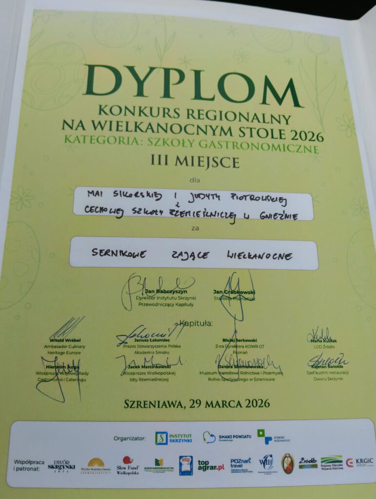 Z przyjemnością informujemy, że uczennice Cechowej Szkoły Rzemieślniczej w Gnieźnie – Judyta Piotrowska oraz Maja Sikorska z klasy 2CER – odniosły sukces w Regionalnym Konkursie Kulinarnym „Na Wielkanocnym Stole 2026”, który odbył się 29 marca br. w Muzeum Narodowym Rolnictwa i Przemysłu Rolno-Spożywczego w Szreniawie. Reprezentując szkołę w kategorii cukierniczej, młode adeptki sztuki cukierniczej, zaprezentowały autorski wypiek pt. „Sernikowe Zające Wielkanocne”, który zachwycił jury zarówno estetyką wykonania, jak i walorami smakowymi.