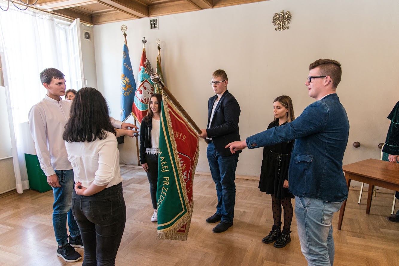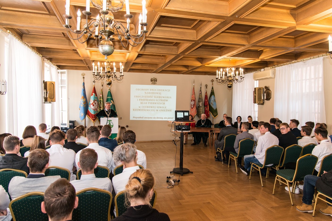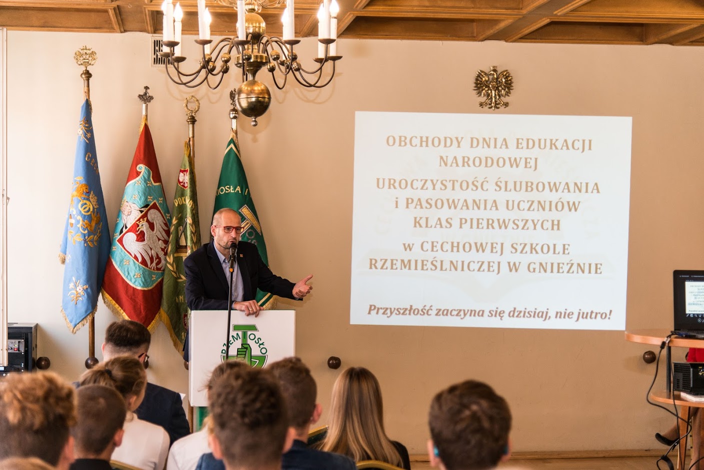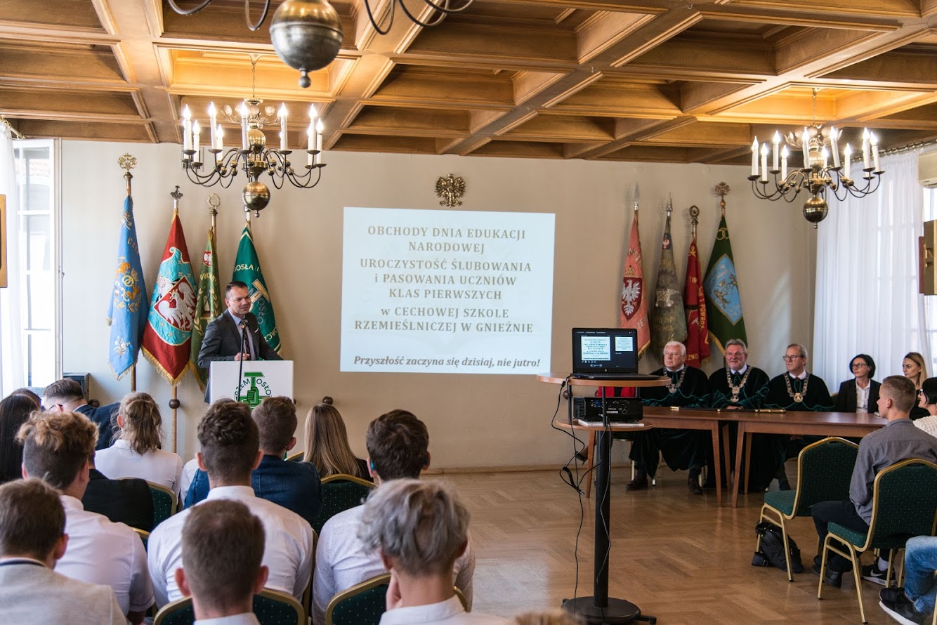W czwartek 11 października br. w Sali Reprezentacyjnej (Auli) Cechu Rzemiosła i Małej Przedsiębiorczości w Gnieźnie odbyła się uroczystość Ślubowania oraz Pasowania uczniów klas pierwszych, a także szkolne obchody Dnia Edukacji Narodowej. W tym jakże radosnym święcie, które na stałe stało się częścią szkolnego ceremoniału, poza Członkami Rodziny Cechowej Szkoły Rzemieślniczej w Gnieźnie, udział wzięli znamienici Goście – Tomasz Budasz – Prezydent Miasta Gniezna, Anna Dzionek – Kierownik Administracji IKE UAM w Gnieźnie, dr inż. Mariusz S. Kubiak – Dyrektor Centrum Wsparcia Rzemiosła, Kształcenia Dualnego i Zawodowego w Poznaniu. Owo jakże podniosłe wydarzenie, stało się okazją do przypomnienia wszystkim zebranym wartości, które legły u podstaw utworzenia, a następnie funkcjonowania Cechowej Szkoły Rzemieślniczej w Gnieźnie. Fundament ten, pomimo tego, że nie jest bytem materialnym, stanowi niezwykle solidne spoiwo Społeczności Szkolnej, o czym przypomnieli w swoich wystąpieniach: dr inż. Krystyna Jarosz – Dyrektor Placówki oraz Stefan Pokładecki – Starszy Cechu Rzemiosła i Małej Przedsiębiorczości w Gnieźnie. Niniejsze zasady znalazły swoje miejsce w rocie ślubowania, a zaliczają się do nich m.in.: troska o dziedzictwo pokoleń rzemieślników, gotowość do pilnego zdobywania wiedzy, szacunek dla rodziców, nauczycieli oraz mistrzów szkolących. Po części oficjalnej uroczystości, na zabranych czekała artystyczna niespodzianka. Adrian Kukurenda, zwany jako: Świagier z 2B, opowiedział, jak to się uczy w Cechowej Szkole Rzemieślniczej w Gnieźnie. Uczynił to jednak w sposób nadzwyczajny, bowiem posługiwał się gwarą wielkopolską. Blubry Świagra z 2B spotkały się z entuzjastycznym przyjęciem zabranych.